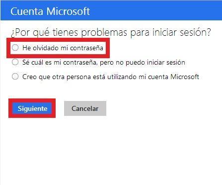 Uma vez dentro, você verá que a Microsoft pergunta qual é o problema que impede você de entrar em sua conta Outlook. Você deverá selecionar a primeira opção, 'Esqueci minha senha' ou 'I forgot my password'. Clique em 'avançar'.