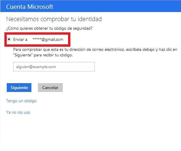 No momento em que você criou sua conta Outlook, o serviço pediu que você indicasse ou um número de telefone ou um e-mail alternativo em caso de incidentes para poder recuperá-la. Pois bem, agora é o momento de fazer uso deste serviço, pois o Outlook pedirá que você especifique por qual via quer receber o código de segurança para recuperar sua senha. Nós usaremos a conta alternativa.
