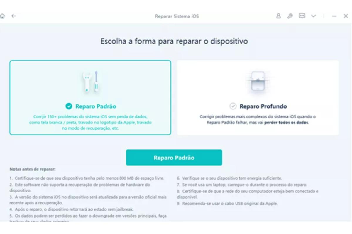 - Na tela seguinte, selecione o "reparo padrão" para prosseguir. Caso você clique na opção "reparo profundo", não poderá manter os seus dados salvos;