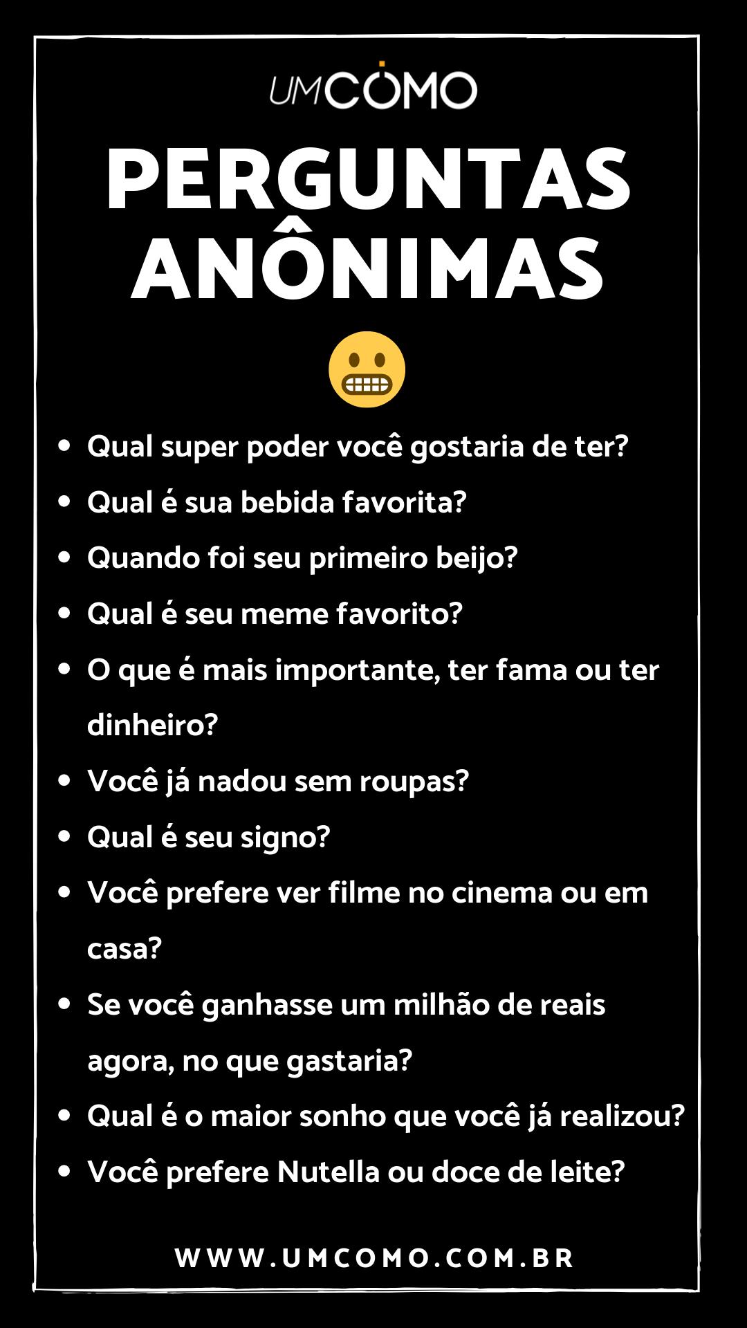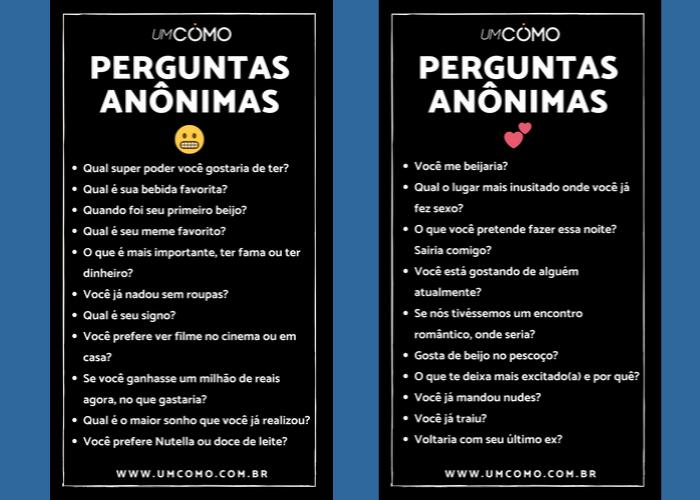 Além das redes sociais nas quais temos a possibilidade de conversar com pessoas de quem gostamos e manter contato, existem redes que proporcionam outra oportunidade: a de fazer perguntas a alguém de forma oculta, em anonimato. Existem muitos sites voltados para esse fim e, atualmente, diversas redes sociais contam com uma função "perguntar". As perguntas anônimas pode ser uma boa maneira de se divertir, fazer novas amizades, brincar com seus amigos e até mesmo paquerar, além de serem úteis para descobrirmos informações que não temos coragem de perguntar diretamente. Por isso, umCOMO preparou para você uma lista de 120 perguntas anônimas para fazer em apps. Divirta-se!