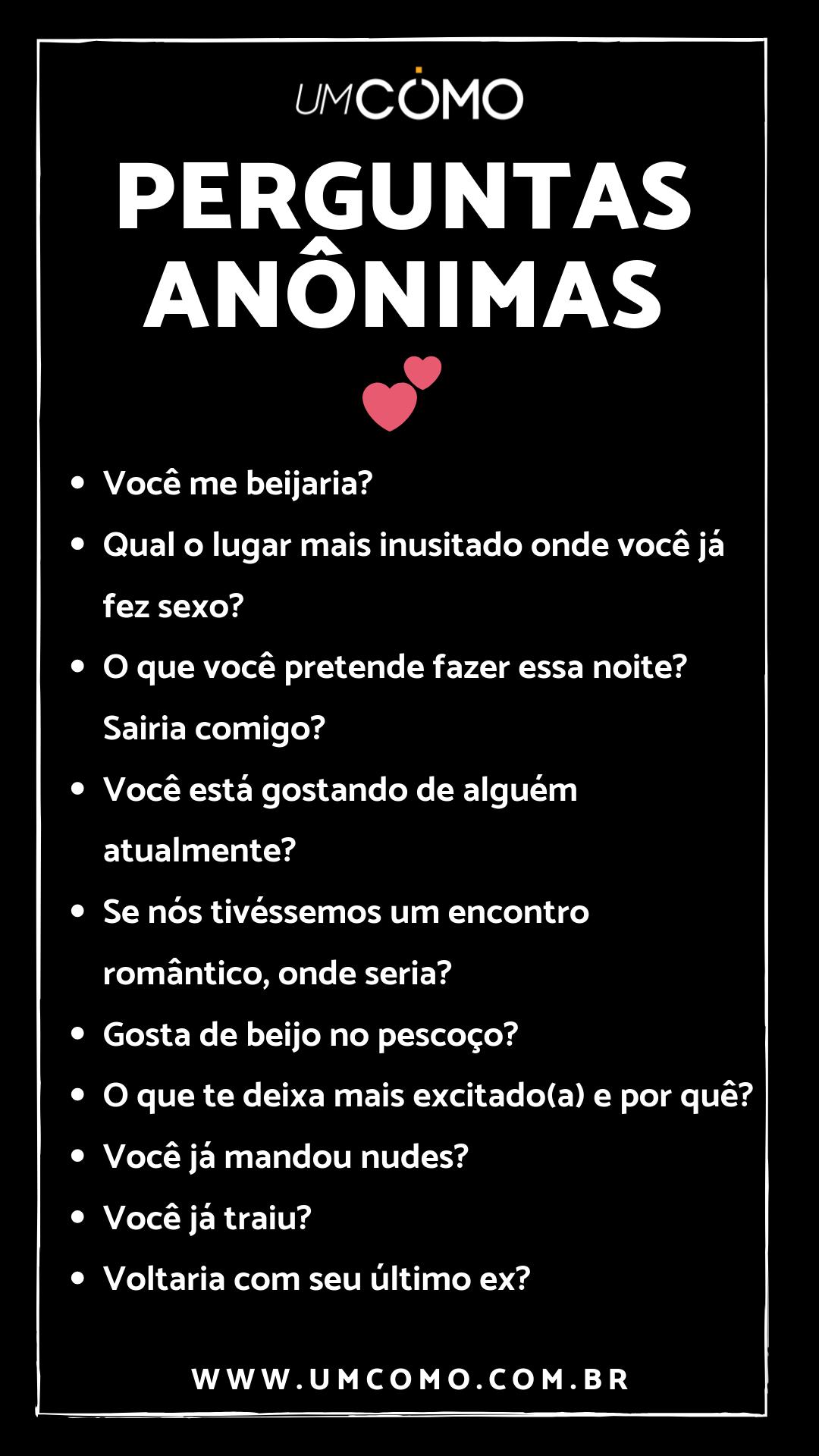 As perguntas anônimas para crush são ótimas para conhecê-lo um pouquinho melhor e até saber se ele realmente está disponível e também para saber outros detalhes picantes de sua personalidade. Confira algumas ideais: