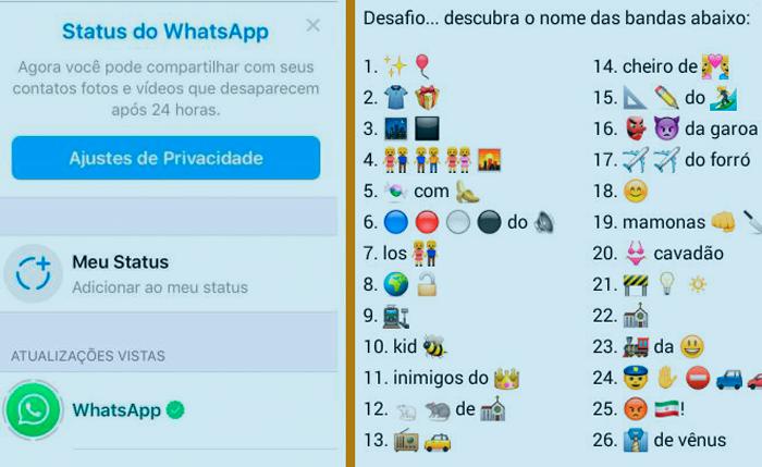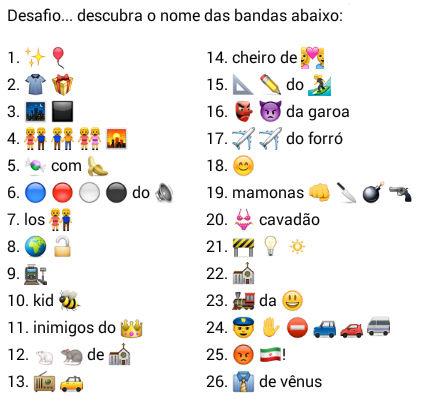 As brincadeiras para status de Whatsapp são uma ótima forma de se aproximar cada vez mais de seus amigos e as brincadeiras de status de Whatsapp com charadas são muito boas para isso. Uma das mais famosas é a brincadeira da charada das bandas nacionais, que é uma boa opção de passatempo no app. Nesse desafio, seus contatos terão que adivinhar qual é a banda com base nos emoticons usados. Na imagem abaixo estão as dicas de bandas com os emojis que seus amigos terão que descobrir e a seguir estão as respostas de cada uma delas: