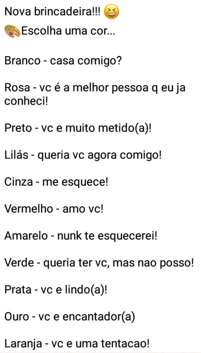 A primeira das brincadeiras para postar no status do Whatsapp é a das cores, que te ajudará a descobrir o que os seus contatos pensam de você e, de quebra, paquerar pelo Whatsapp. Ela funciona assim: primeiro mande no seu status uma foto com a lista de cores abaixo - cada uma tem um significado diferente - e depois os seus contatos que quiserem participar do jogo deverão te mandar de volta uma das cores.