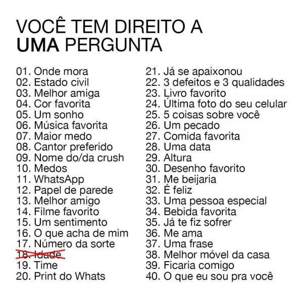 Outra brincadeira de perguntas para status do Whatsapp se joga assim: copie as perguntas a seguir no seu WhatsApp. Cada um dos seus contatos terá direito a fazer uma pergunta. Quando a pergunta for feita a risque da imagem e poste ela de novo até que não haja mais perguntas a serem feitas para você. Essa é uma das melhores brincadeiras para status de amizade ou ‘brincadeiras para status sobre mim’.