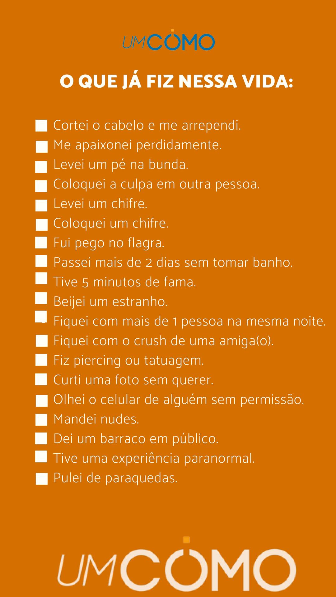 O desafio para insta do coisas que já fiz na vida é um dos mais legais justamente porque permite muitas ideias de perguntas diferentes. O umCOMO preparou uma versão com algumas perguntas que já tínhamos por aqui, mas você pode colocar as perguntas que quiser. Uma super dica de inspiração é usar as perguntas do artigo 'Eu Nunca, as melhores perguntas'.