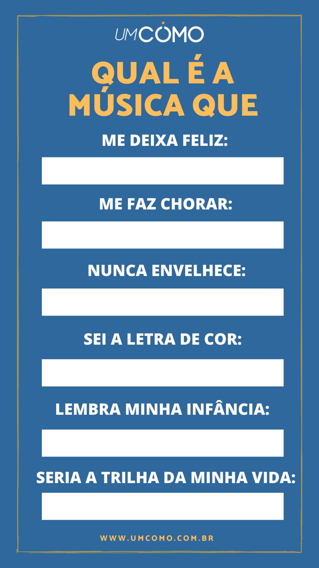 Outra das brincadeiras para postar no story do Instagram que você deve fazer uso de template é o desafio da música. Você deverá fazer uso dele para responder em cada uma das categorias apresentadas uma música que te causa um sentimento específico.
