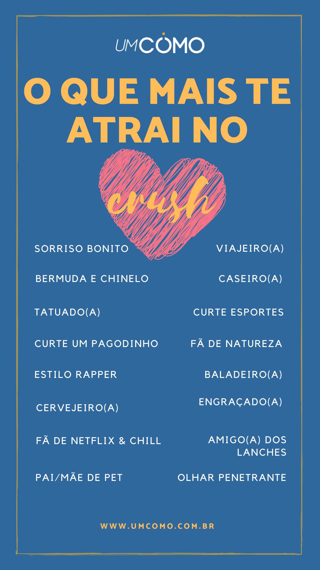 Se você está solteiro(a) e procura alguém para algo mais casual ou sério, uma boa ideia é fazer uso das brincadeiras para colocar no story do Instagram para chamar atenção daquela pessoa que você acha interessante e que gostaria de conhecer melhor. Na brincadeira O Que Mais Te Atrai, você deverá utilizar o template abaixo para marcar as coisa que costumam te atrair em alguém, assim, pessoas que combinam com você e que também têm interesse em você terão aquela desculpinha para puxar um papo.