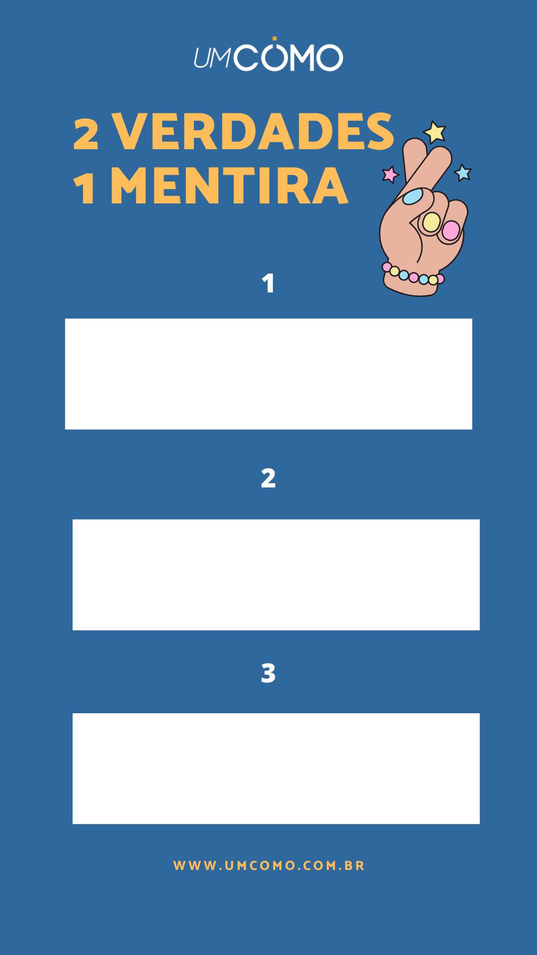 Caso você seja do tipo que ama saber o que os outros pensam de você, ainda que seja só por curiosidade acerca da imagem que você passa, essa brincadeira é perfeita e você não pode deixar de fazer. Para brincar, basta salvar a imagem abaixo e, nos campos, escrever duas verdades e uma mentira sobre você, deixando que seus contatos adivinhem o que é o que. Na hora de pensar sobre o que escrever, tente colocar fatos que poucas pessoas sabem ou que ninguém sabe, além disso, pense numa mentira que soe um pouco mirabolante mas que, ainda assim, seja passível de ser verdadeira.