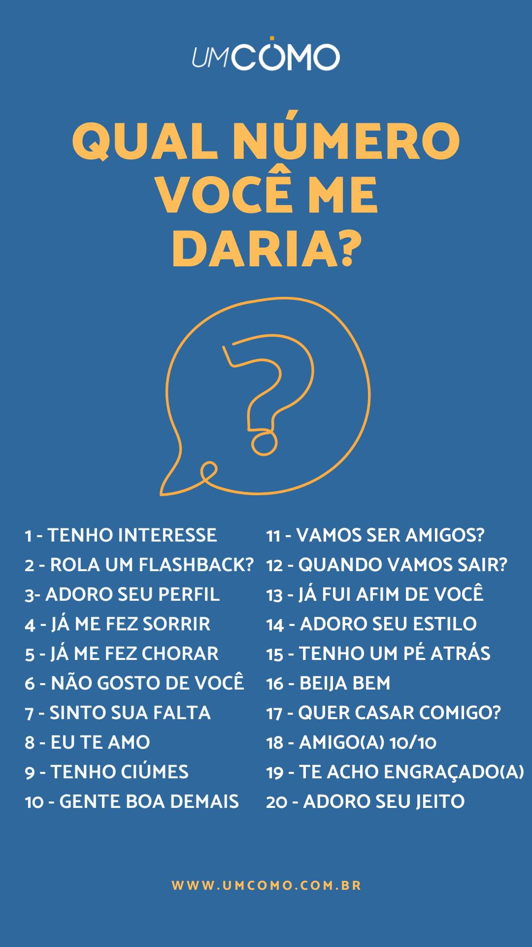 A brincadeira dos números é das mais surpreendentes, pois funciona da seguinte forma: você posta o template nos status do WhatsApp e seu contato terá que mandar um número de 1 até 20, que corresponderá ao que essa pessoa pensa de você. Se quiser deixar a coisa um pouco mais "caliente", você pode combinar com seus contatos que, independente da pergunta que for feita, você também responderá, assim, ninguém sai perdendo.