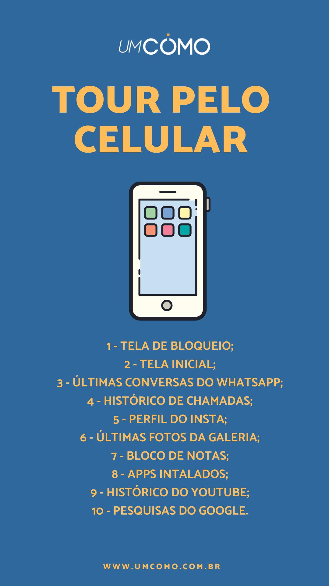 O "tour pelo celular" se trata de uma brincadeira para status do Whatsapp na qual seus contatos irão te pedir algum dos prints abaixo de acordo com os números no template, ou seja, se alguém te mandar o número 5, você terá que mandar um print do seu perfil no Instagram, se pedir o 8, você deverá mandar um print da tela de aplicativos do seu celular e assim por diante.