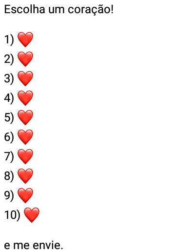 A brincadeira dos corações é bastante tranquila e pode ser mandada para qualquer pessoa de quem gostamos, desde familiares até amigos e namorados. Para fazê-la, basta salvar a imagem abaixo e mandar para quem quiser. O que cada coração significa é: