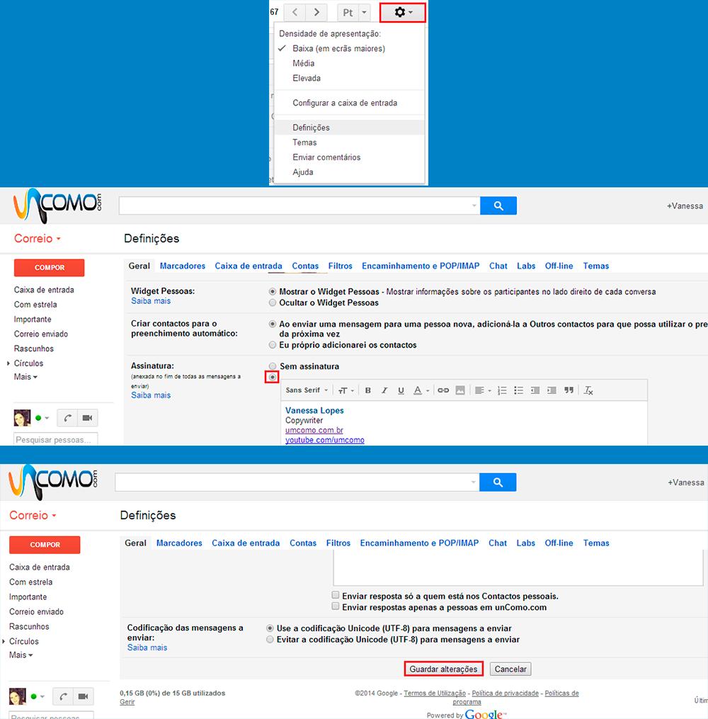- Depois, desça até ao final da página e clique no botão "Guardar alterações". Pronto! Já está feita sua assinatura personalizada do Gmail para cada e-mail que você enviar.
