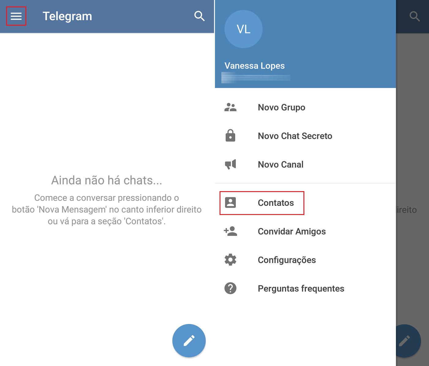 Para usuários de Android apenas é possível adicionar contatos no Telegram que já estejam utilizando o serviço e, apareçam na lista de contatos ou, convidar contatos que ainda não utilizam o serviço. Para isso, abra o aplicativo e na tela inicial dos chats clique no ícone dos três traços horizontais que se encontra no canto superior esquerdo. De seguida, clique na opção de "Contatos".