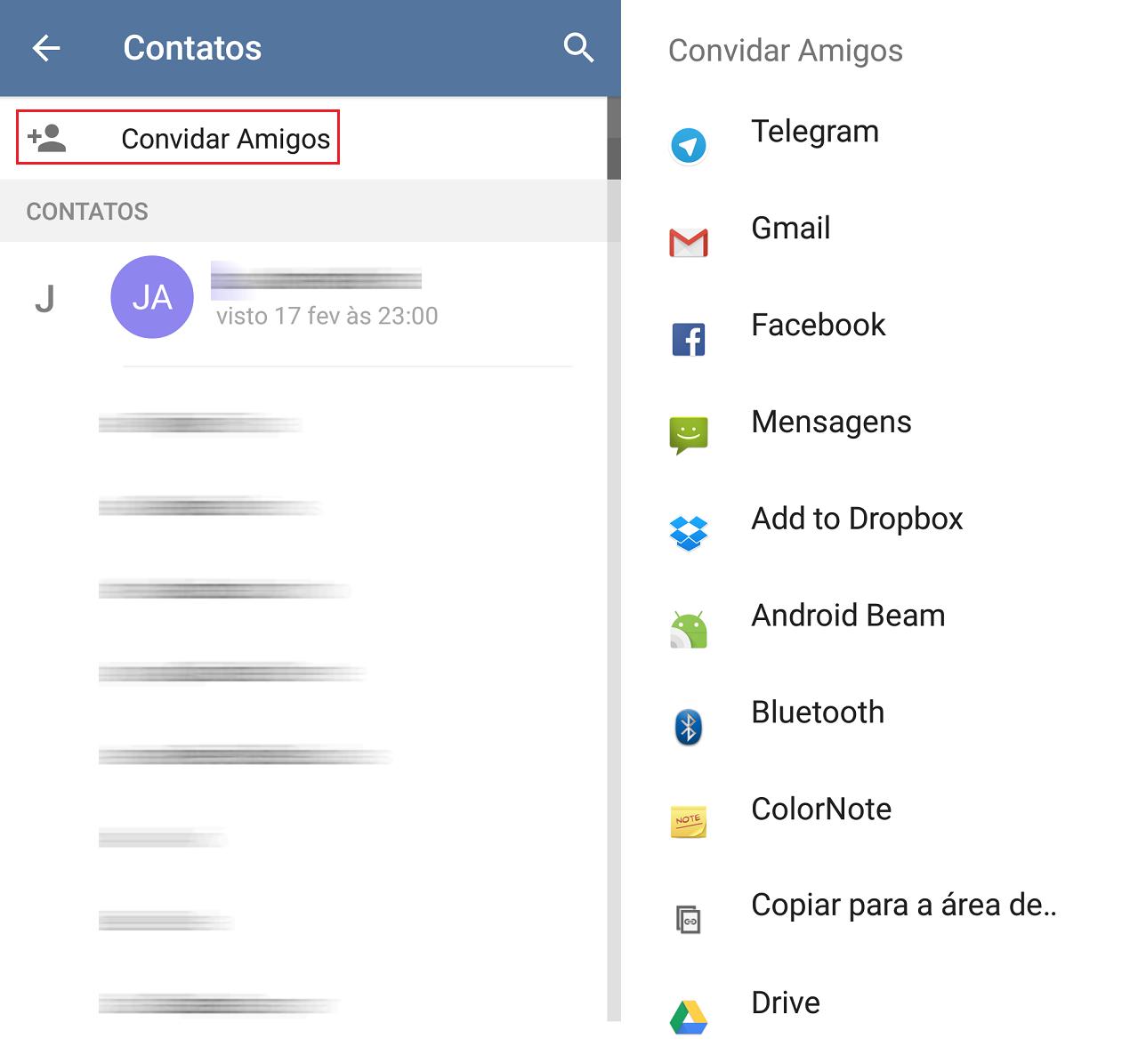 Na tela seguinte aparecerá a lista de contatos do seu telefone, você pode clicar sobre um deles para o adicionar à sua lista do Telegram, caso essa pessoa já esteja cadastrada no aplicativo. Caso contrário, você tem a opção de enviar um convite para a pessoa se juntar ao Telegram. Clique em "Convidar amigos" ou então sobre o contato que ainda não está cadastrado e, escolha uma forma de o convidar. Pode fazer isso enviando uma mensagem para o seu celular, um e-mail ou até fazendo uma publicação no Facebook para convidar os seus amigos a se juntarem a este serviço de bate-papo.