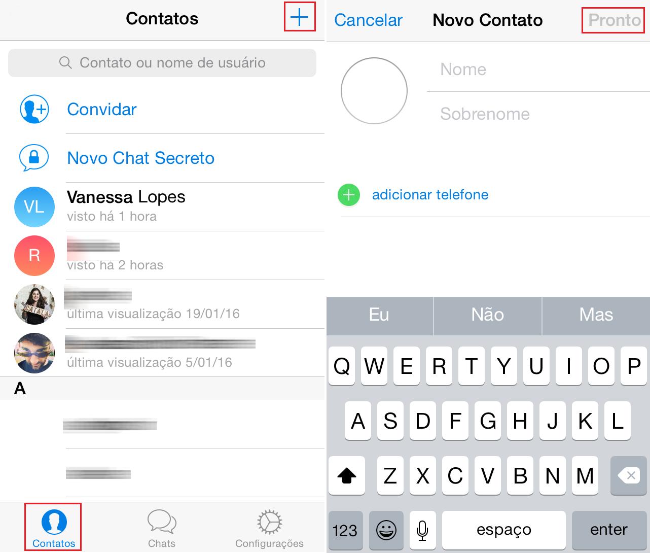 No caso do iPhone, saiba que já pode adicionar manualmente contatos no Telegram. Para isso, deverá abrir o aplicativo e clicar no ícone de Contatos no canto inferior esquerdo. De seguida, clique no ícone do "+" no canto superior direito. Depois digite o nome da pessoa e clique em "Adicionar telefone". Insira o número de telefone da pessoa e clique em "Pronto" para adicionar esse contato no Telegram.