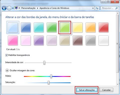 Para você alterar a cor de outros itens do Windows, você deve repetir os dois passos anteriores (5 e 6) para cada elemento de qual deseja alterar a cor. Ou seja, se você realizou os passos para mudar a cor da barra de iniciar, deverá repetir o mesmo processo para alterar o menu, por exemplo. Isso pode ser cansativo, porém permite que você escolha cores diferentes para cada área. Ou seja, o Windows 7 oferece um nível maior de personalização.
