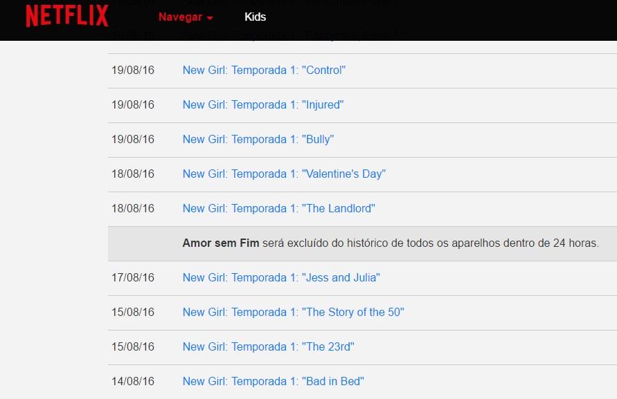 Essa página te levará ao seu histórico de filmes assistidos. Repare que ela mostra o nome e o episódio de cada série ou filme em ordem do mais recente para o mais antigo. Se você quer apagar apenas uma série ou filme, basta selecionar o "X" que está ao lado direito dela.