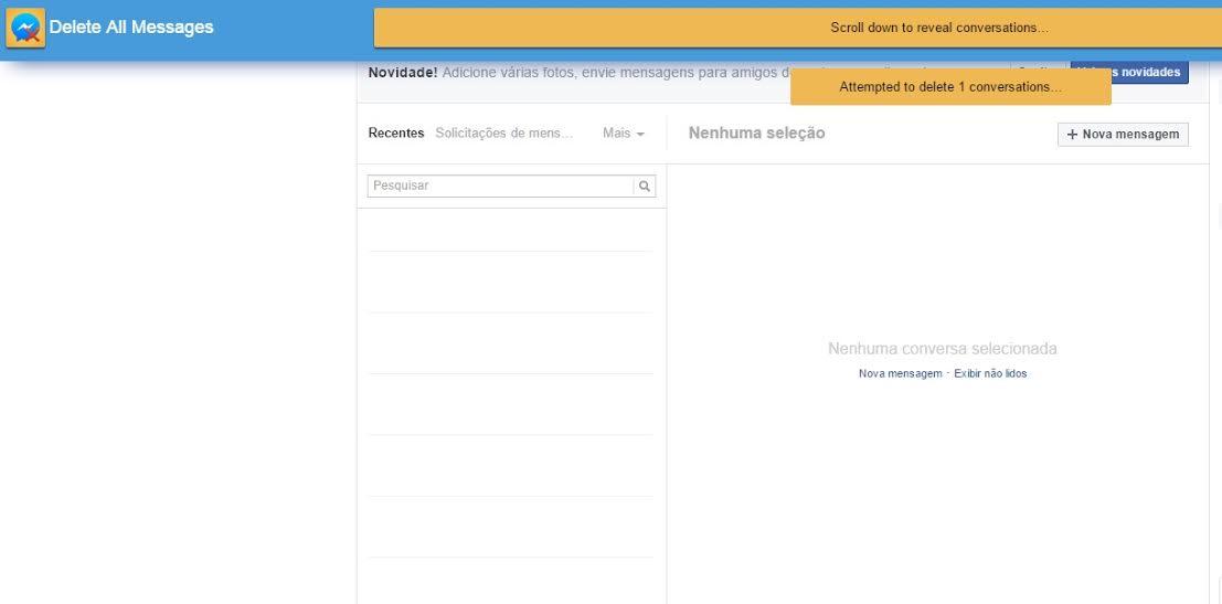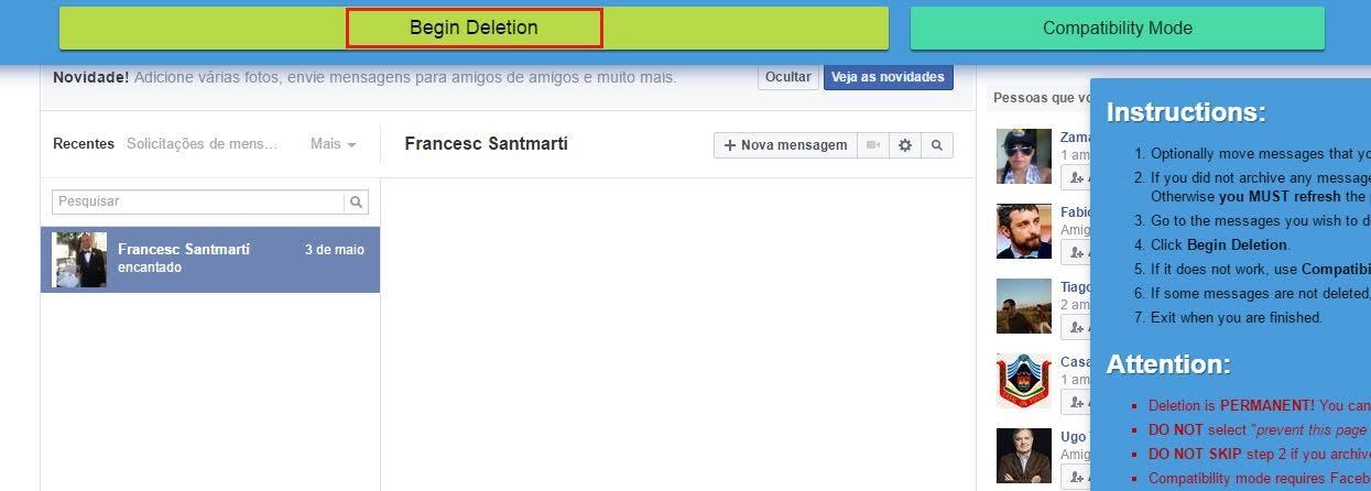 De seguida, no final do painel onde está a URL, encontra o botão azul da extensão que foi adicionada. Ao clicar no botão da extensão vai aparecer um botão que lhe permite apagar todas as conversas do Facebook. Clique em "Begin Delection".