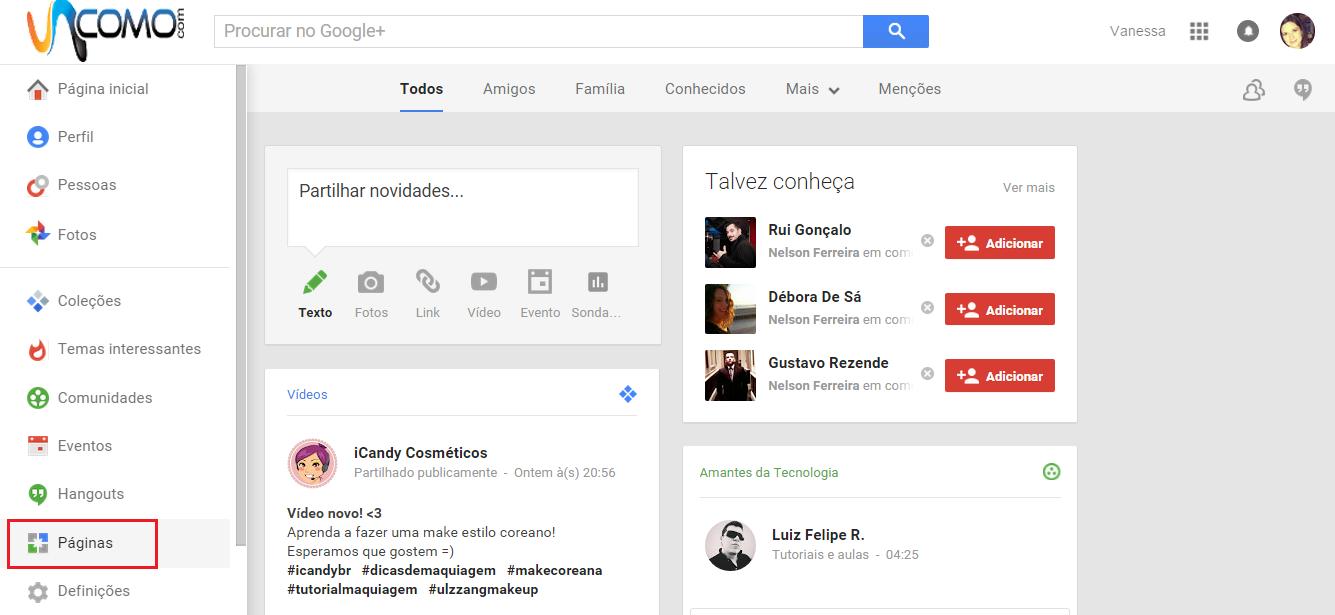 Se já tiver uma será bem mais fácil, porque só terá que acessar ao seu Google+ e ir até à opção 'Páginas' do menu da esquerda e escolher a página em questão, caso gerencie mais de uma.
