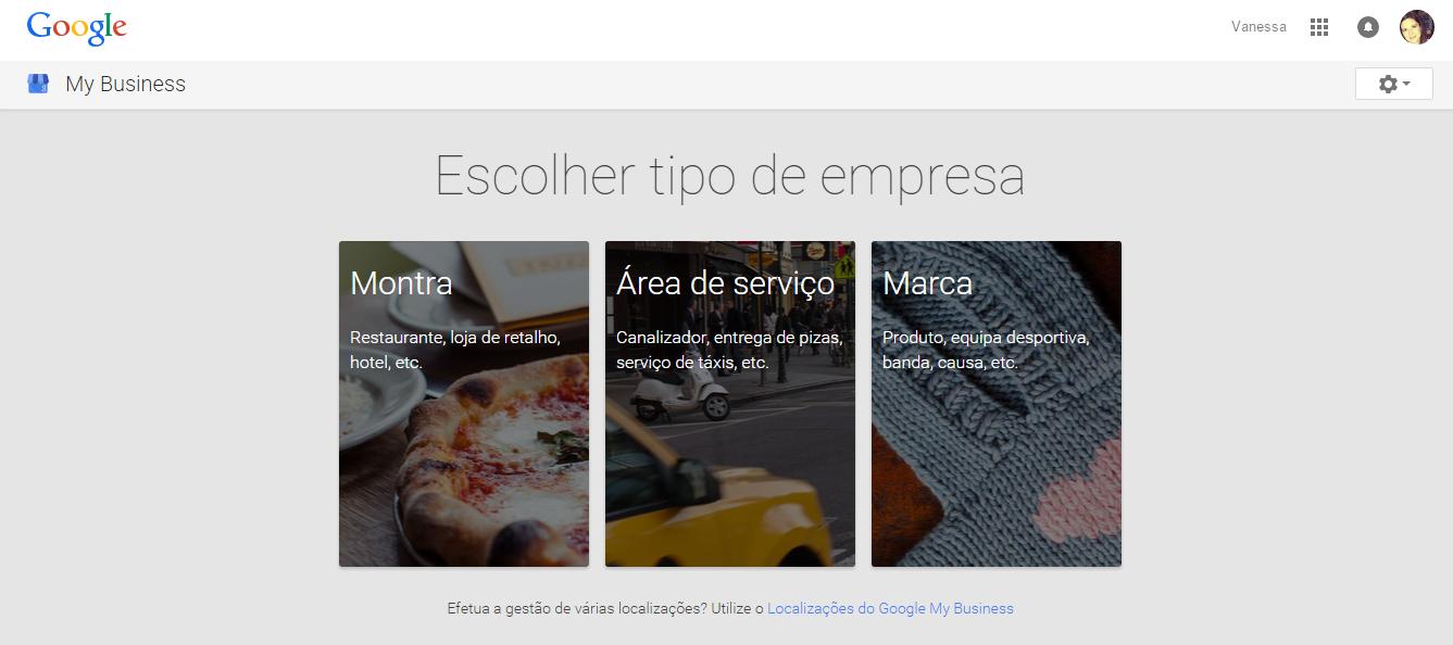 Na hora de criar a página do seu negócio que associará à localização do Google Maps, deverá escolher o tipo de empresa: