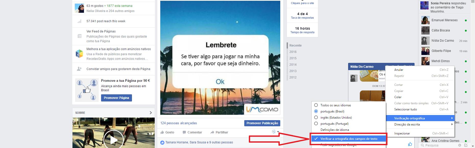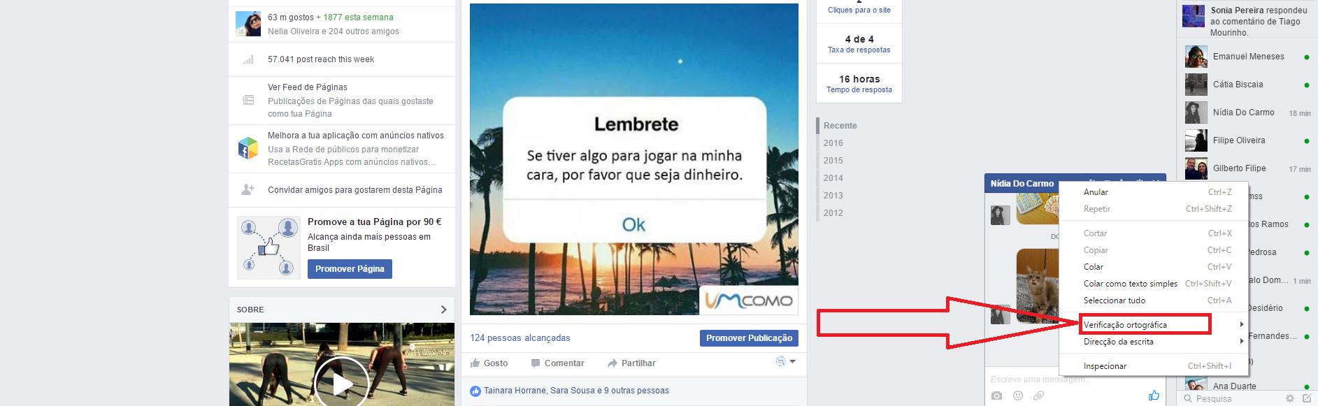 Quando isso acontecer, poderá observar que uma das opções diz: "Verificação ortográfica". Deve posicionar o cursor sobre essa opção e clicar para poder ativar o corretor ortográfico do Facebook.