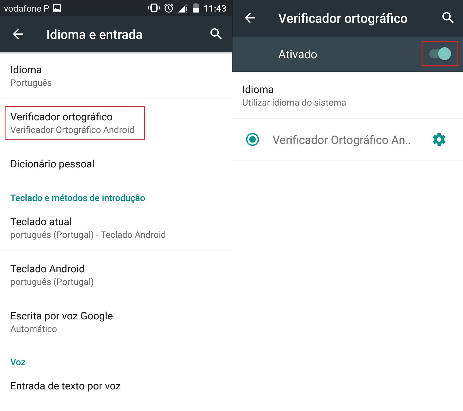 Logo abaixo do idioma, deverá selecionar a opção de Verificador ortográfico para fazer com que a revisão de textos do seu Android volte a funcionar como antes. Depois na seguinte tela só tem que deslizar o botão ao lado de Desativado, de forma a ficar verde e Ativado.