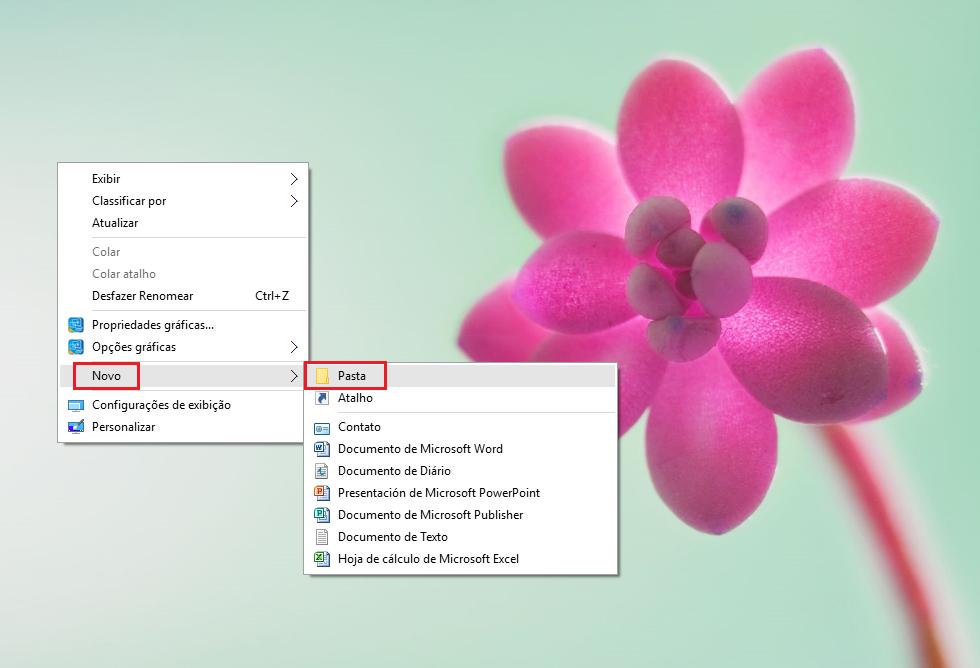 Para ativar o Modo Deus no Windows 10, comece por criar uma pasta num lugar de sua preferência, como a área de trabalho. Para criar uma pasta basta clicar com o botão do mousse em um espaço vazio e clicar em Novo - Pasta. Por enquanto deverá deixar a pasta sem nome.