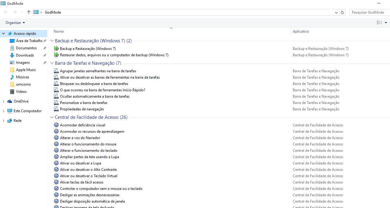 Agora dê um duplo clique sobre este novo atalho e se abrirá a janela do Modo Deus com todas as configurações do sistema. Note que, para facilitar a procura do usuário, todas as ferramentas do GodMode estão devidamente categorizadas e por ordem alfabética dentro de cada categoria. No Modo Deus do Windows 10 você poderá encontrar ajustes de aparência, vídeo, teclado, som, sistema, programas padrão, contas de usuário, ajustes de personalização e muito mais. Se desejar, pode ainda realizar uma pesquisa do que procura no canto superior direito em "Pesquisar GodMode".