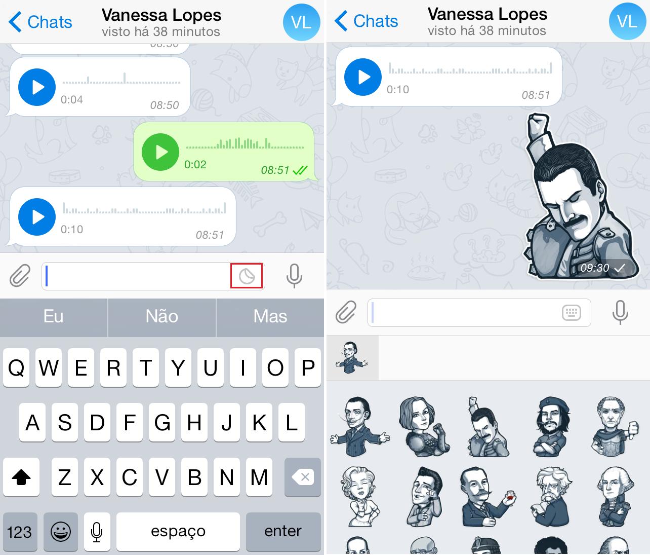 De seguida, deverá tocar no ícone que aparece dentro do campo de mensagens que tem a forma de um círculo. Os stickers disponíveis deverão aparecer embaixo do campo da mensagem e, para enviar uma figurinha basta clicar sobre ela. Agora pode se divertir enviando estas figurinhas para os seus amigos.