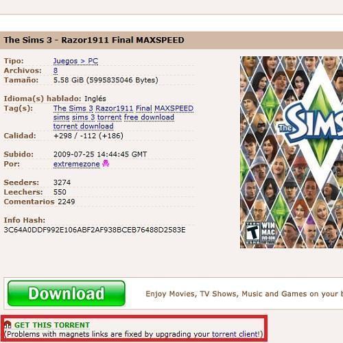 Vá para esta página de ThePirateBay e selecione 'Get this torrent'; desta maneira, aparecerá uma nova janela de Torrent perguntando se você realmente deseja baixar The Sims 3. Clique em 'Aceitar' e espere até que finalize o download. Dependendo da conexão da Internet e do computador, este processo pode demorar mais ou menos tempo.