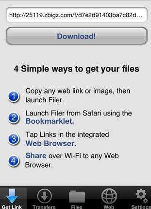 Já estamos quase! Agora abra o Filer Lite e pressione em "Get Link", depois cole a URL que tem e pressione o botão grande Download.