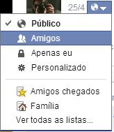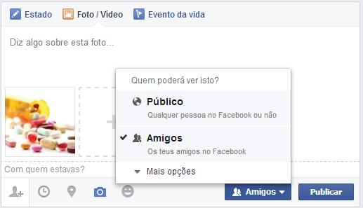 Caso esteja publicando uma nova foto ou álbum e quiser alterar as definições de visualização da mesma, deve clicar no botão do lado esquerdo de "Publicar", que por defeito diz "Amigos". Aqui poderá definir quem poderá visualizar a sua foto, tal como em fotos já publicadas pode escolher se pretende partilhar com amigos, público em geral, apenas você ou definir uma privacidade personalizada.