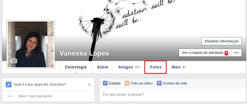 O primeiro passo consiste em acessar à página de Facebook, entrar com o seu usuário e senha e aceder à sua página de "Perfil". Uma vez aí, verá que na parte central da tela, logo abaixo da sua foto de capa, aparecem diferentes botões e um deles é o de "Fotos", clique sobre ele.