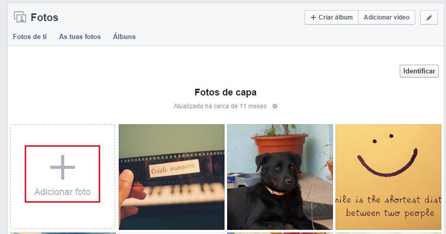 Uma vez que esteja na página de "Fotos", verá que lhe aparecerem diferentes opções para fazer o upload de uma foto para o Facebook: pode criar um álbum, adicionar fotos ou adicionar vídeos. Mas se o que quer é adicionar uma nova imagem a um álbum que já tenha criado, então terá de clicar em "Álbuns", escolher o que quer e na tela aparecerão as fotos deste álbum e a primeira opção de todas é um quadrado com o sinal de "+" que é para adicionar uma nova foto a essa álbum.