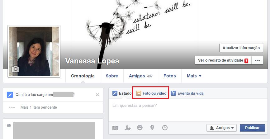 Também existe a opção de fazer o upload de uma foto ligada a uma publicação em concreto. Por exemplo, se acabou de cortar o cabelo e quer mostrar na rede social para que os seus amigos vejam ou algo do gênero, pode fazer isto escrevendo em seu mural e selecionando a opção "Foto/Vídeo". Terá que escolher a foto que quer adicionar à sua publicação e aparecerá tudo junto quando os seus amigos virem esta publicação.