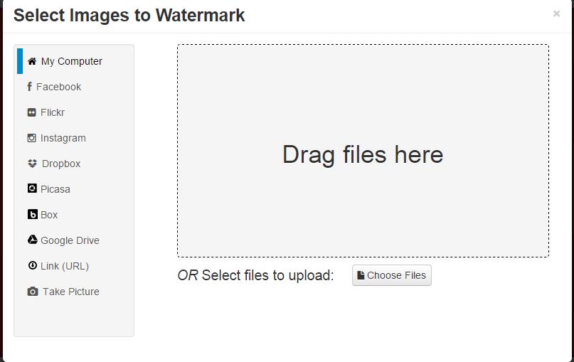 Na tela seguinte que será aberta, clique em de onde pretende fazer o upload da imagem, se do seu computador, do Facebook, Flickr, Instagram, Dropbox, Picasa, Box, Google Drive ou se pretende tirar uma foto.