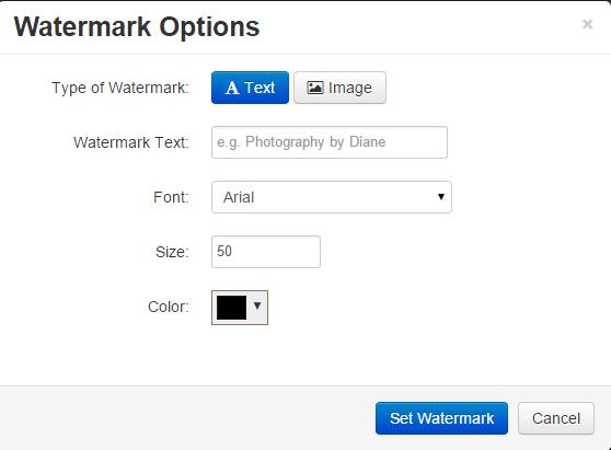 Na tela seguinte, você poderá adicionar a sua marca d'água em forma de texto ou imagem. Se escolher imagem, deverá clicar em "image" e fazer o upload de uma imagem do seu computador. Caso pretenda adicionar só texto, escreva o texto que deseja adicionar e escolha o tipo, tamanho e cor da letra que pretende utilizar.