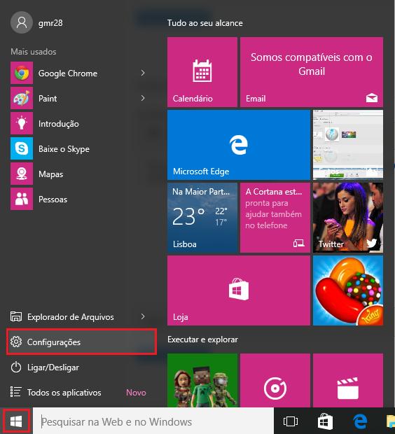 Para configurar recursos da família no Windows 10, comece por clicar no botão do menu Iniciar e acessar a Configurações.