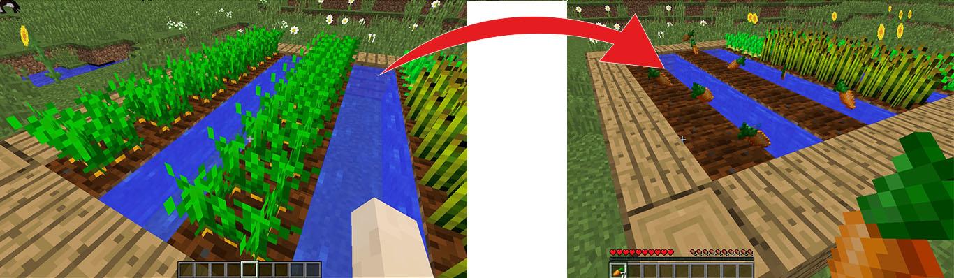 Por fim temos as plantações, neste processo precisa de ter, pelo menos, uma cenoura. Assim que conseguir arranjar uma cenoura poderá multiplicar a mesma fazendo uma plantação de cenouras.