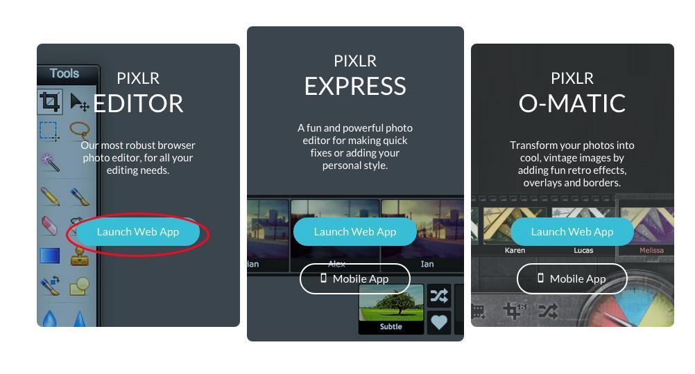 Quando já estiver no Pixlr, role um pouco a página até encontrar três grandes quadros com os três principais serviços da página: Pixlr Editor, Pixlr Express e Pixlr O-Matic. O que nos interessa é o primeiro, Pixlr Editor, um editor online muito similar ao Photoshop. Clique sobre o botão "Launch Site App".