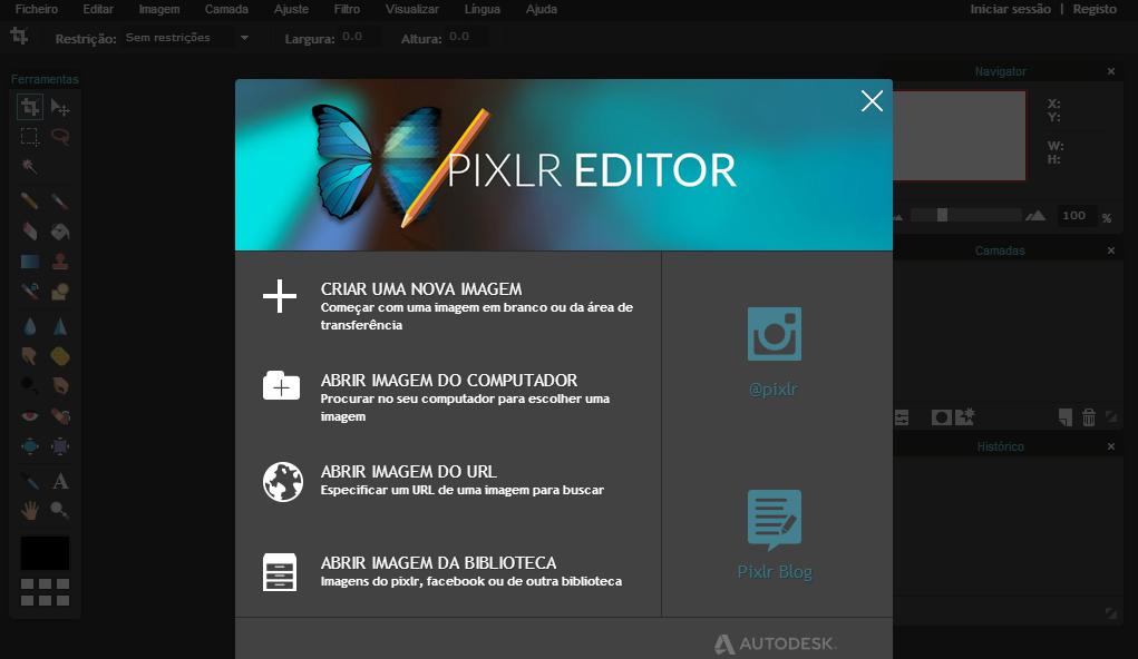 Entrará no editor, onde verá uma janela através da qual deve escolher a imagem que quer retocar. Pode optar por abrir a partir do computador (é possível que seja esta a opção que queira), a partir de uma URL ou a partir de uma biblioteca de imagens (do pixlr, das suas fotos do Facebook, etc). Selecione a opção que quiser e abra a imagem.