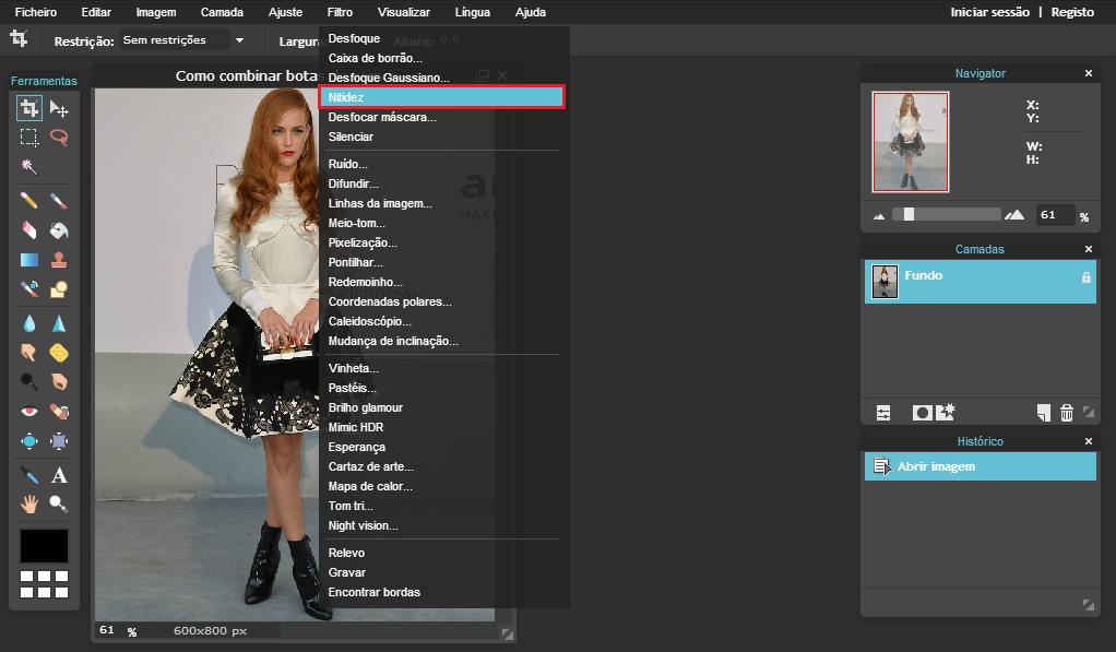 O Pixlr faz focos muito sutis, por isso é possível que depois de passar o filtro você note que a diferença não é suficiente. Para continuar a corrigir a sua foto você só tem que repetir o processo do passo 4 (Filtros>Nitidez) todas as vezes que quiser até que a imagem fique do jeito que gostar.