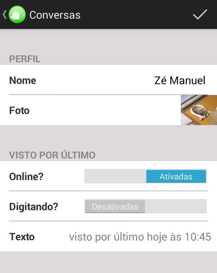 De seguida, deverá adicionar o nome e a foto da pessoa com quem quer fingir a conversa. Mais abaixo pode escolher se quer que essa pessoa esteja online ou se está a digitar e, pode ainda escolher quando é que a mensagem foi lida.