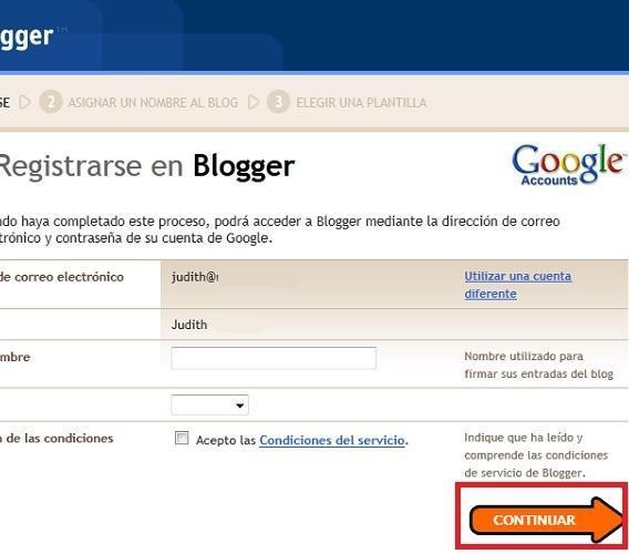 Preencha o formulário em branco com os seus dados e selecione "Continuar". Tenha em conta que depois de completar o registro, poderá aceder ao Blogger através do e-mail que colocar neste passo.