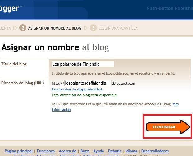 Atribua um título ao blog, bem como um endereço. A seguir, faça clique em "Continuar".