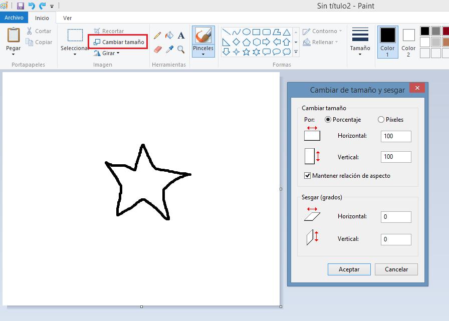 Para fazer um gif animado é necessário gravar várias imagens (que vão representar as frames) todas do mesmo tamanho. Para isso irá definir um tamanho para a sua tela. No menu "Inicio" selecione a opção de mudar de tamanho. Tem a opção de inserir através de pixeis e de percentagem, a altura e a largura e ainda uma checkbox para manter a relação de aspecto.