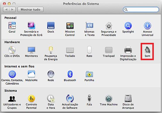 Clique em "Som", que aparece na categoria "hardware" para desativar o áudio do MacBook.