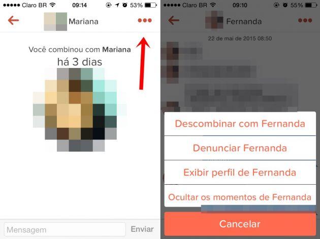 O próximo passo consiste em tocar o botão “...” na tela que aparece o bate papo, localizado no canto superior direito. Dessa forma, surge um menu, no qual você deve escolher a opção “Descombinar com [nome do usuário]“. Depois é preciso confirmar, tocando novamente no botão “Descombinar” e, pronto, não haverá mais como a outra pessoa falar com você. Nessa hora, é possível ainda selecionar um motivo para a sua ação, porém, é opcional e, por isso, você não precisa justificar a sua desmarcação se não quiser.