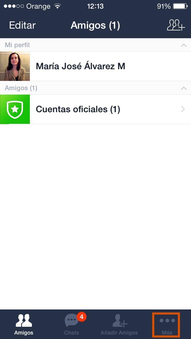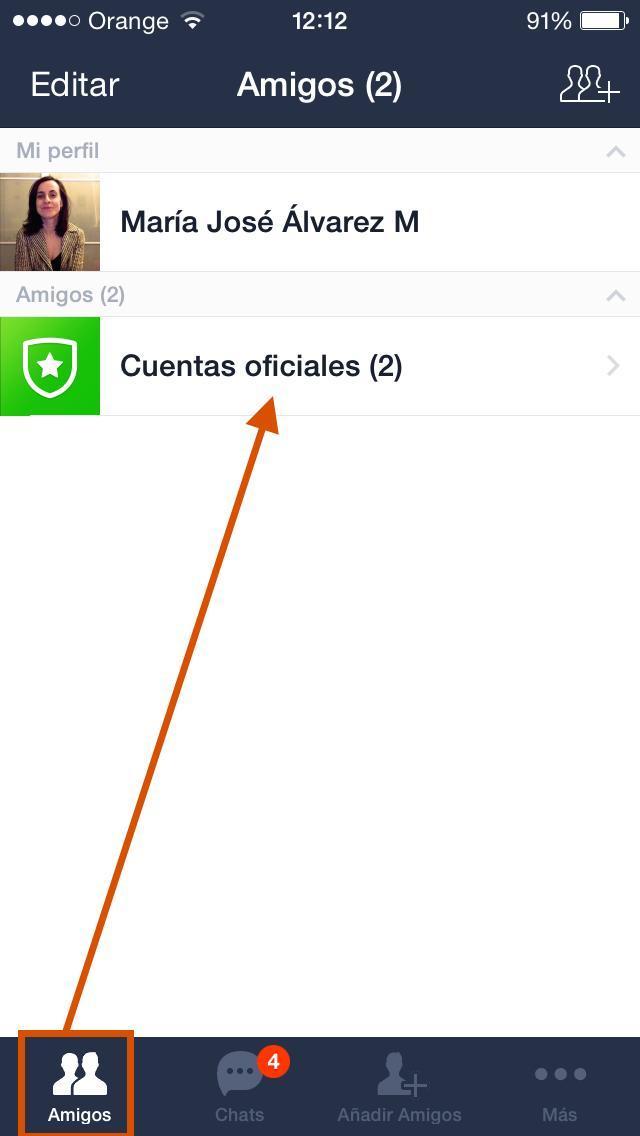 A primeira coisa que tem que fazer para eliminar um contato no Line é clicar no ícone do canto inferior esquerdo onde tem escrito "Amigos". Neste tutorial, como não temos nenhum contato real, usaremos uma das Contas oficiais do Line como exemplo. Para isso, clicamos também sobre o link correspondente.