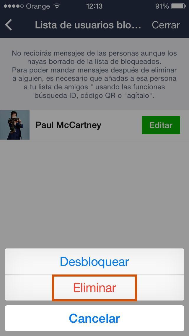 Agora deverá encontrar um botão do lado direito do nome do contato que diz "Editar". Clique nele. Ao fazer isso, aparecerão três opções no fundo da tela, clique em "Eliminar" para excluir o contato da sua conta do Line.